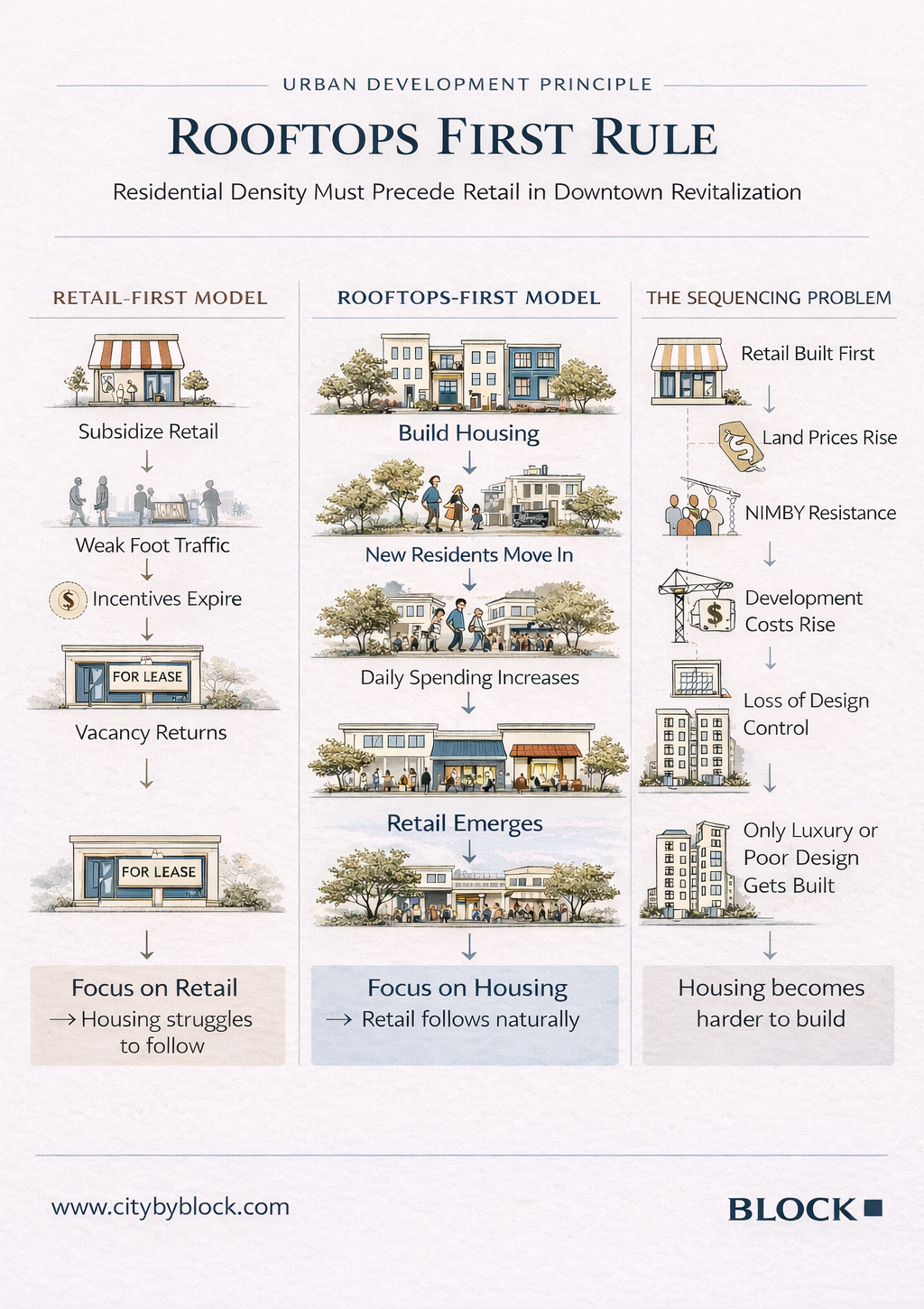 Many revitalization efforts fail because they try to seed retail before the residential demand exists.